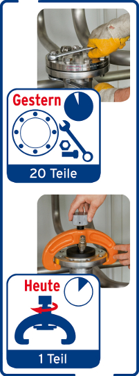 Alle Bauteile, die zum Verschließen eines Flansches benötigt werden, sind integriert – somit gibt es kein Zusammensuchen mehr von Werkzeugen und Einzelteilen.