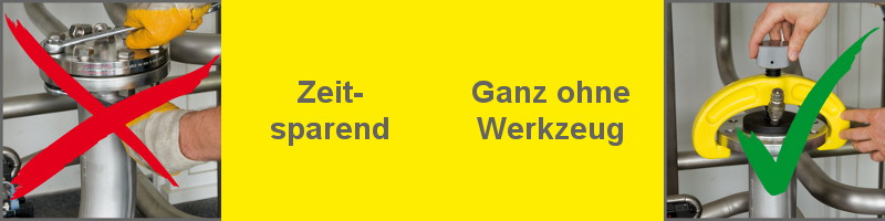Ansetzen, Handknauf von Hand drehen – und schon ist der Flansch in Sekunden verschlossen.