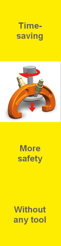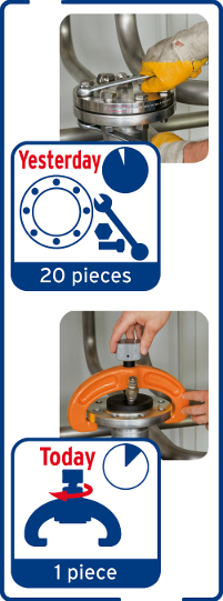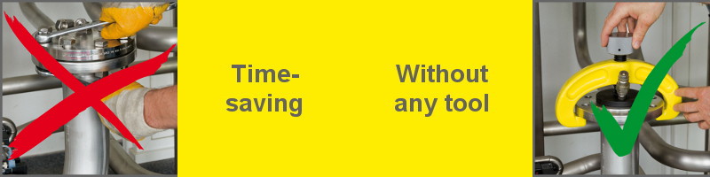 The fiXX-loc can be put into use very quickly: Put it in place, turn the handle – and the flange is shut in a few seconds. All parts that are necessary to close a flange are integrated – you don’t have to search for components and tools any more.